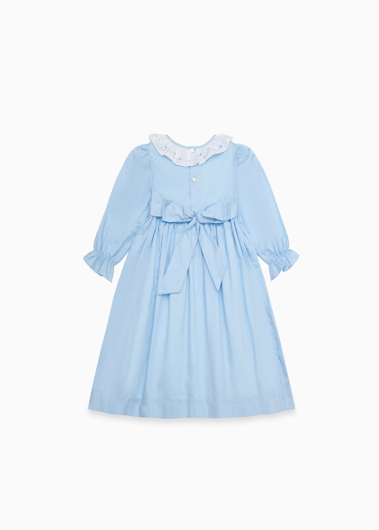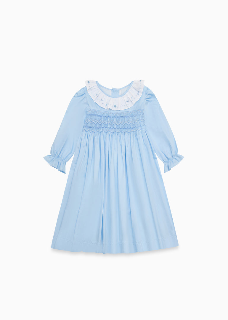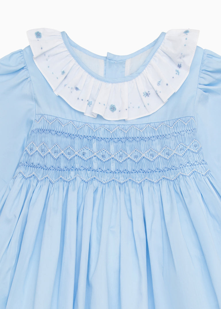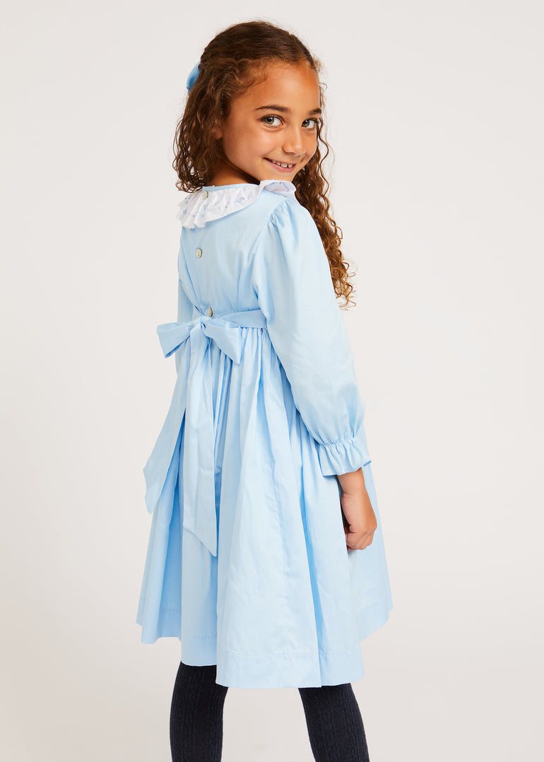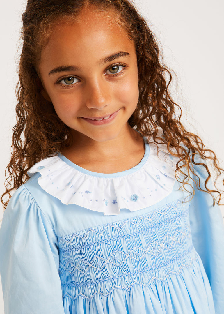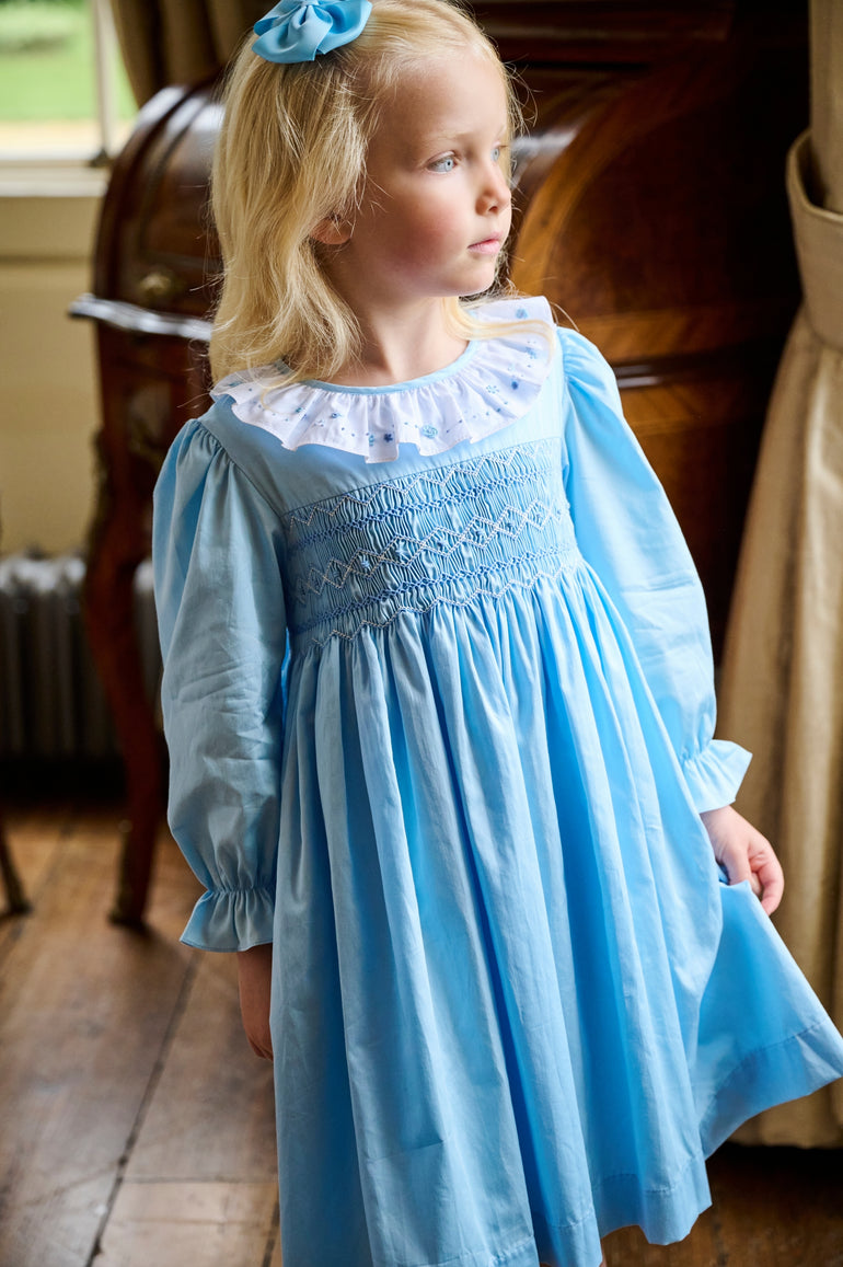 In addition to the hand smocked panel, one of the standout features of the Clementine Dress is the beautiful sky blue hand-embroidered florals adorning all around the collar. This delicate touch adds a touch of whimsy and sophistication to the dress, making it truly special.
