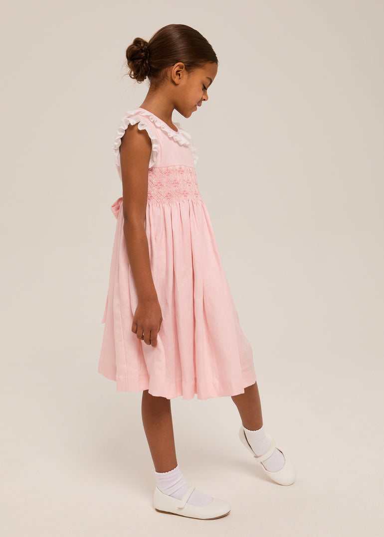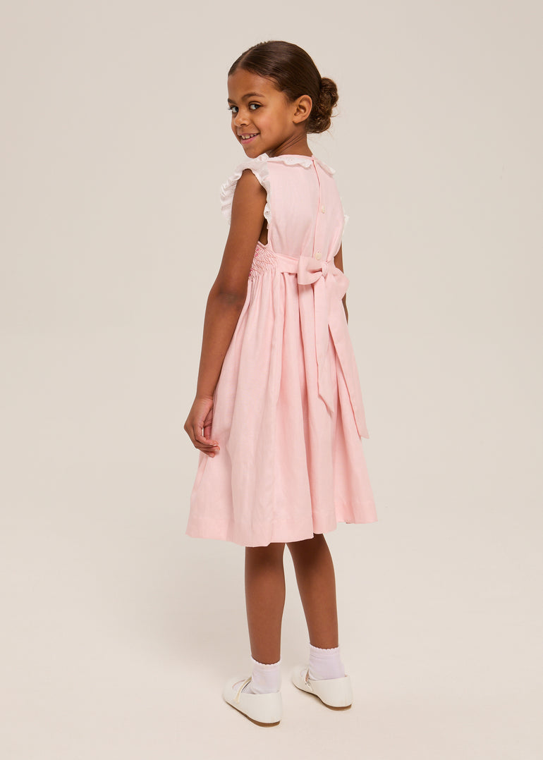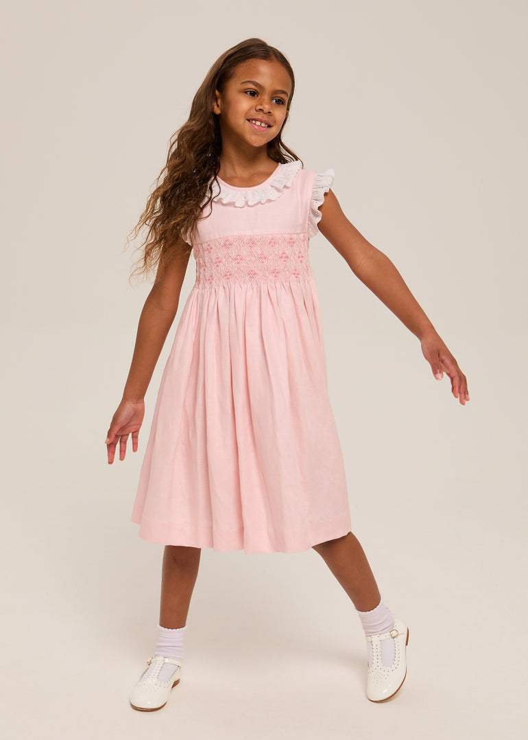 Pure Irish linen in soft blush pink. Hand-smocked bodice. White scalloped collar and flutter sleeves.
