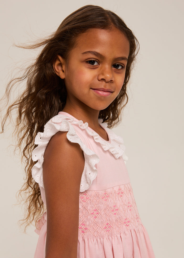 Hand-smocked across the bodice. White scalloped collar and sleeve trim. The kind of pink that photographs perfectly in natural light.