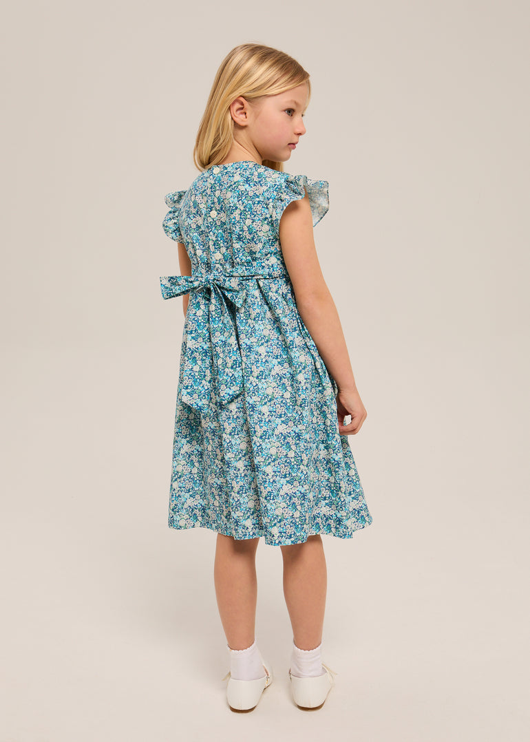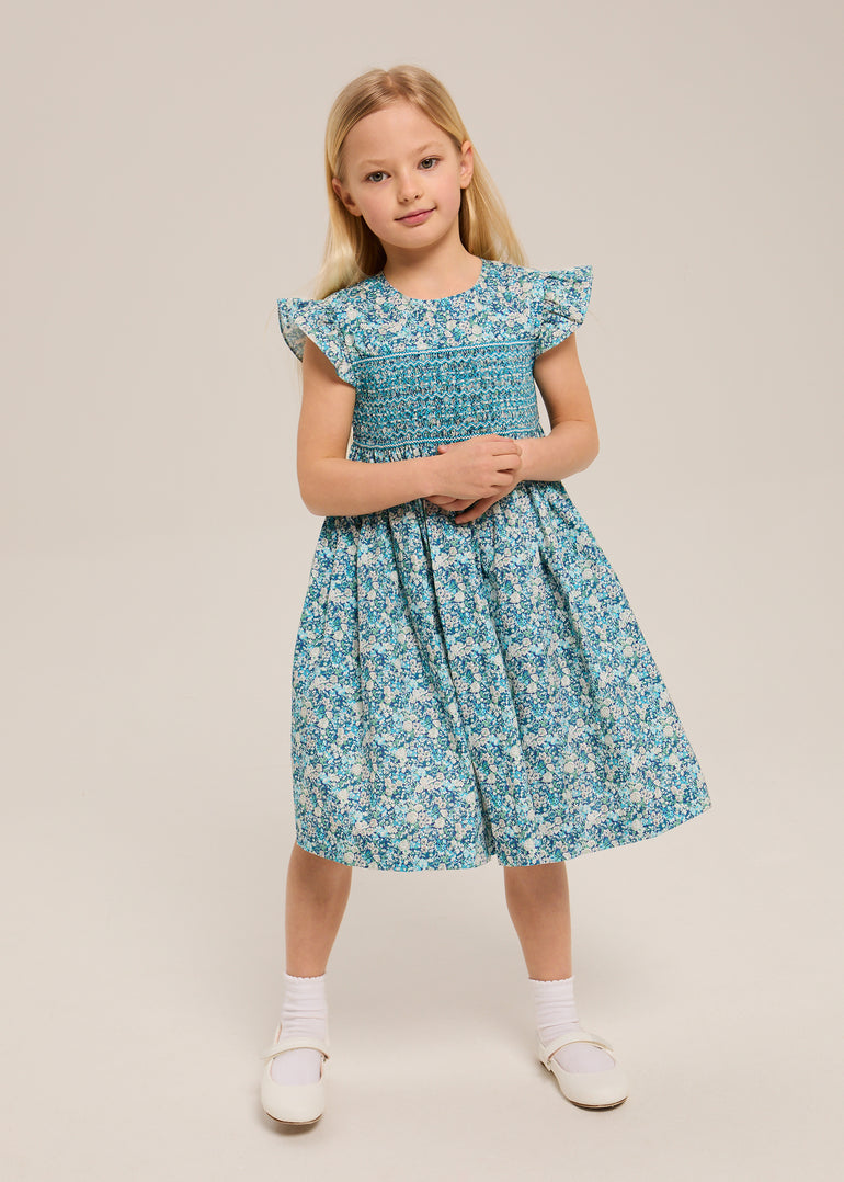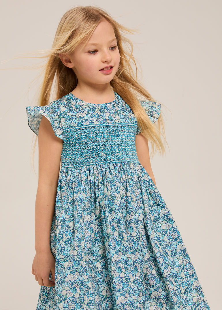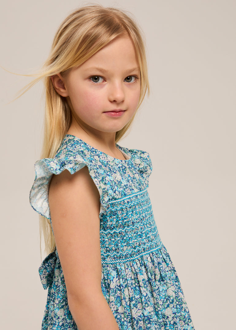 Flutter sleeves instead of puffed. A fuller skirt that moves when she does. The details that make it special: hand-smocked, Liberty cotton, flutter sleeves.