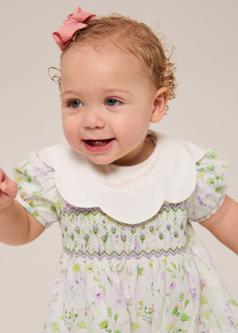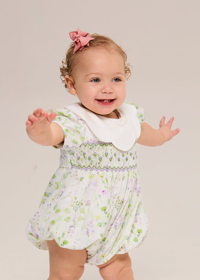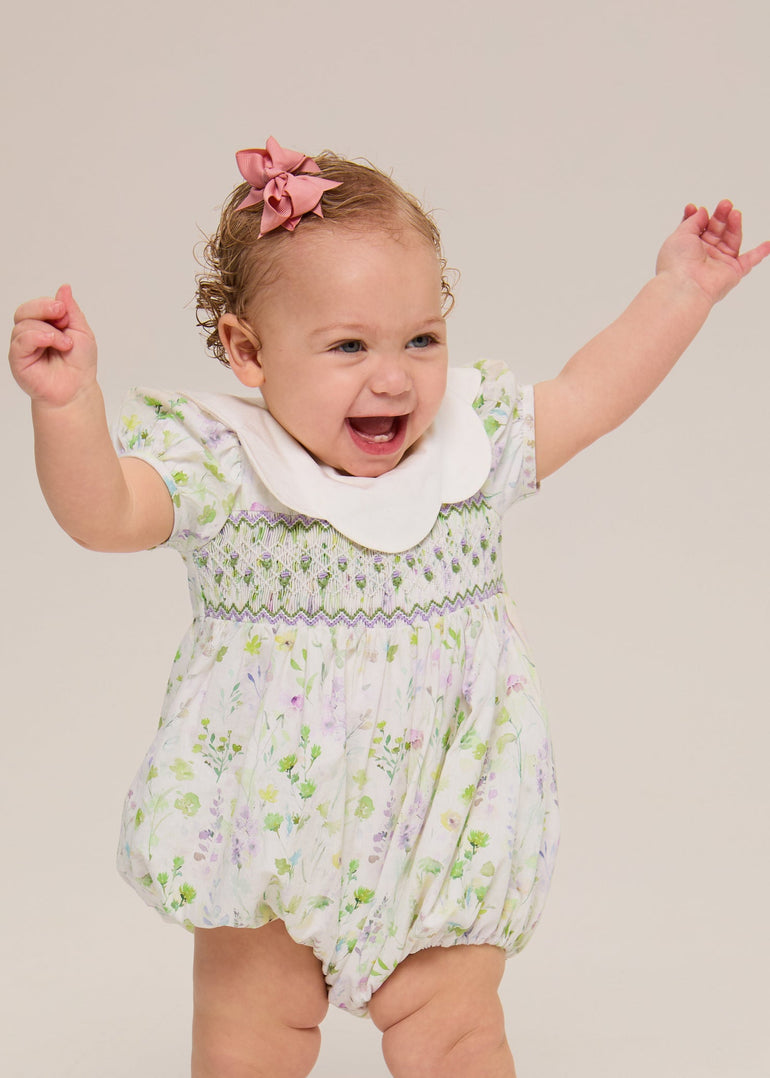 The Belgravia Romper is hand-smocked in sage and lilac on the finest white cotton — a watercolour meadow of clover, buttercup and bloom that makes people stop mid-conversation and ask where it's from. The wide scalloped collar sits perfectly. The puff sleeves, the full little skirt, the precision in every stitch — this is the kind of piece that makes other mothers quietly take note.