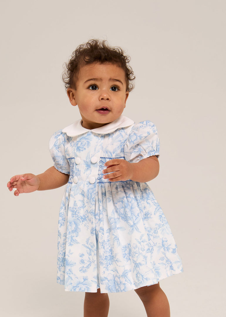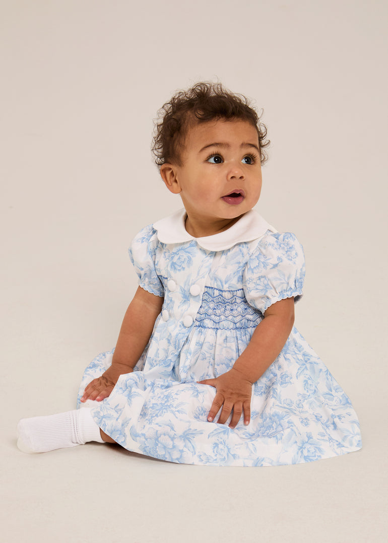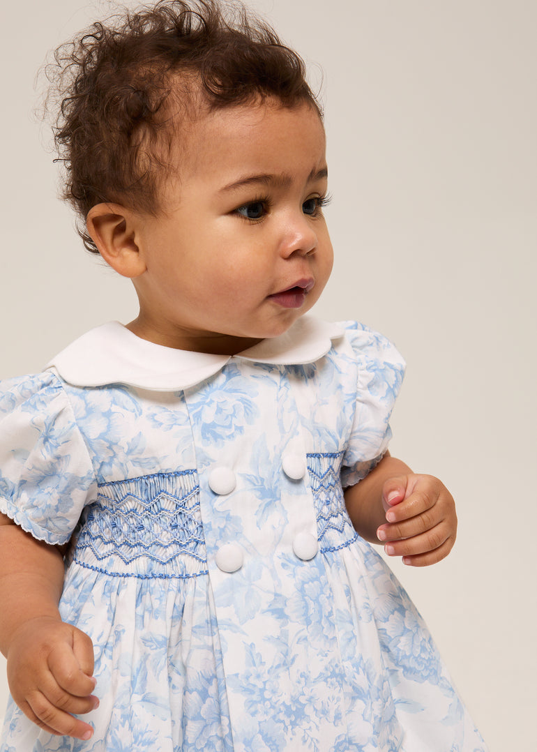 Liberty's exclusive Bridgerton floral print in soft blue and white. Hand-smocked bodice. White Peter Pan collar. Scalloped detailing.