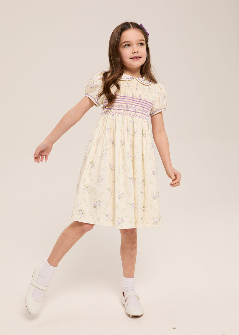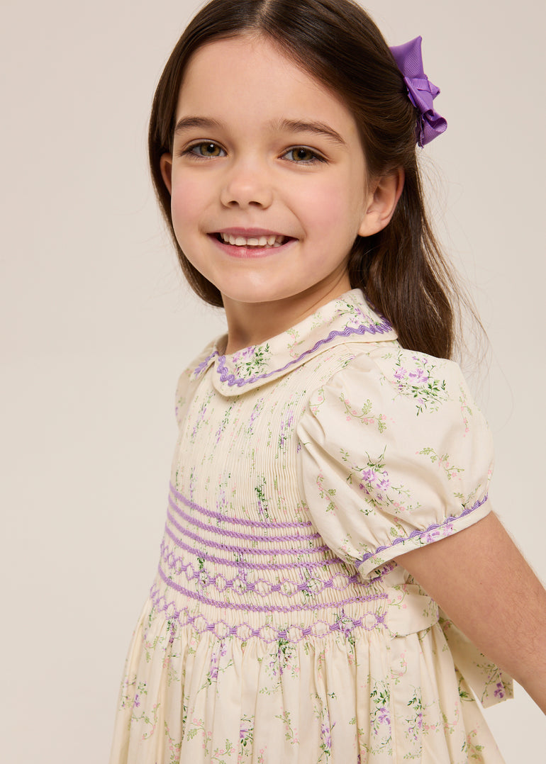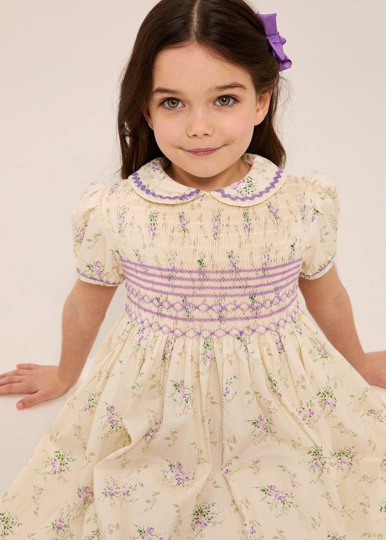 Butter-cream cotton scattered with the tiniest clusters of lavender roses — the kind you might find pressed between the pages of a well-loved book — and a bodice hand-smocked in violet so fine it looks like it belongs behind glass. It doesn't, of course. It belongs on her, running through the garden, trailing into Sunday lunch, utterly oblivious to how completely she stops the room.