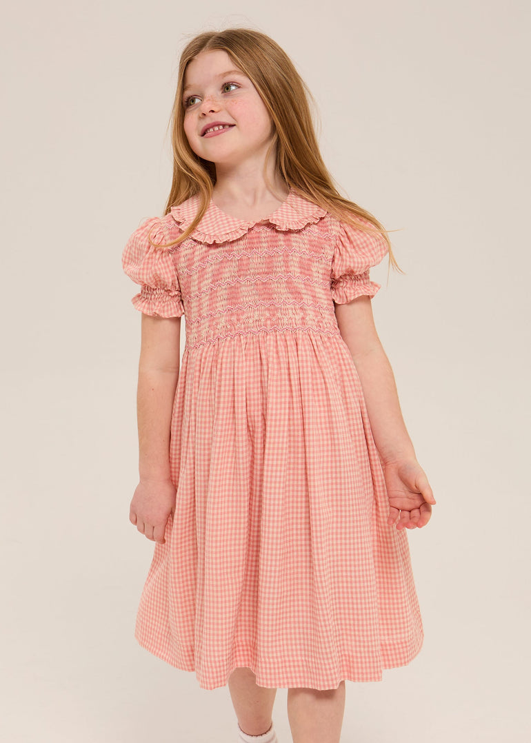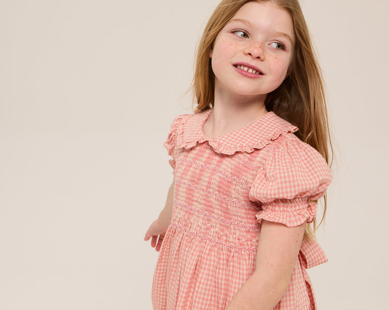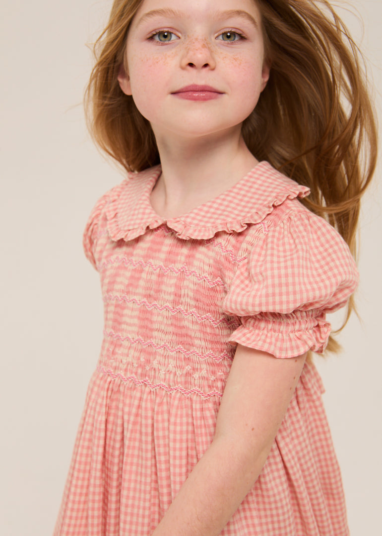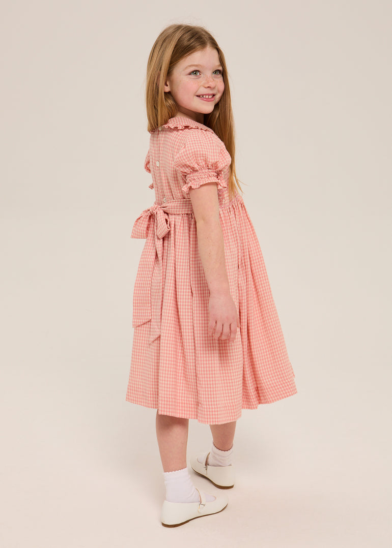 Summer in a dress. The kind of coral-pink that catches late afternoon light and makes every photograph look warm. Tiny gingham check. Hand-smocking across the bodice. Scalloped details on the collar and sleeves.