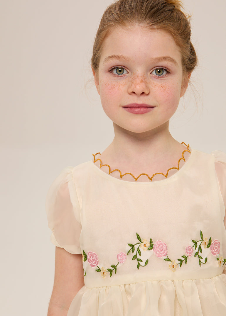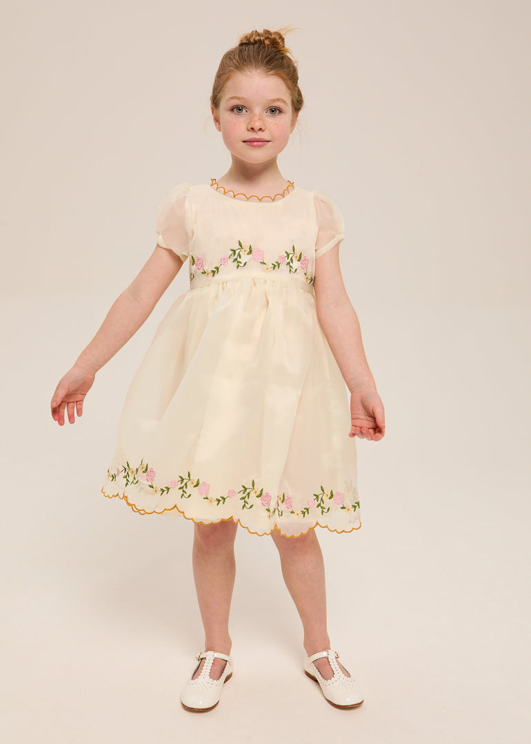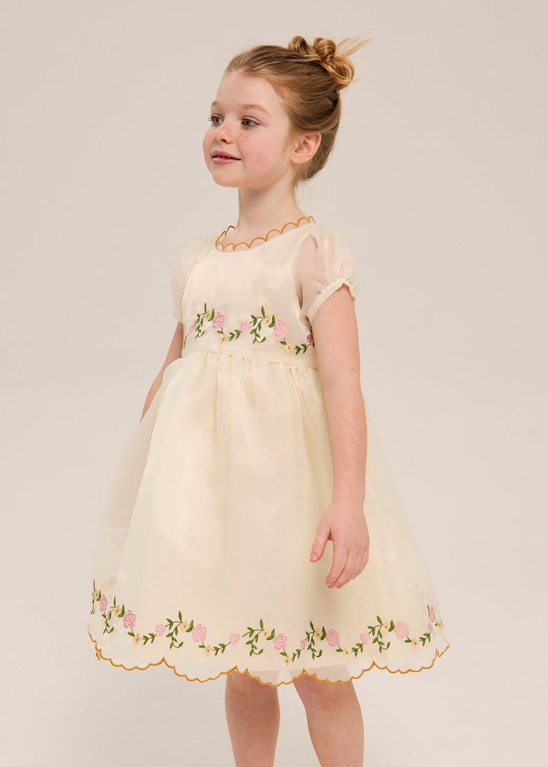 Cut from the most exquisite butter yellow organza ; warm, luminous, the kind of fabric that catches April light as she moves and holds the room completely still. A embroidered garland of pink roses trails across the bodice and sweeps the hem, finished with a scalloped gold edge that makes this the most extraordinary thing in any room she enters.